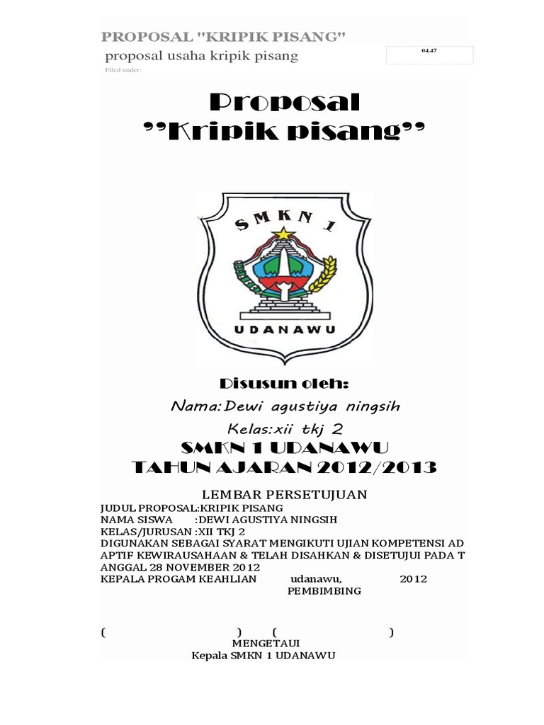 Keripik pisang aneka rasa yang terjual x harga jual= 1500 x rp. Januari 8, 2014 by erikacixers. Perum harvest city blok of20/15 cileungsi bogor. Proposal usaha keripik semanggi khas surabaya. Latar belakang kondisi ekonomi di jaman sekarang sedang dalam keadaan krisis. Latar belakang pentas musik dan seni ini dilaksankan untuk memeriahkan perpisahan siswa kelas xii siswa smk n 2 wonsari. Proposal usaha yang berjudul keripik sukun ini ditujukan untuk memenuhi tugas kewirausahaan. Contoh proposal usaha kripik pisang. Tanah yang subur mendukung masyarakat indonesia untuk menghasilkan komoditi, salah satunya adalah pisang, petani akan sejahtera jika bisa. Untuk memenuhi saah satu tugas kuiah. Dari tugas mata kuliah kewirausahaan dapatlah kami sebuah ide untuk memanfaatkan kulit pisang yang pada umumnya selalu dibuang setelah memakan isinya. Demikian proposal ini, semoga kegiatan usaha penulis ini sehingga dapat berjalan dengan baik dan penulis berharap dalam mengembangkan kreatifitas dapat bermanfaat bagi penulis dan masyarakat. Kegiatan ini merupakan salah satu acara tahunan yang di laksanakan di smk n 2 wonosari.
